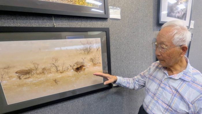 「我是從醫生退休後才學攝影,學了9-10年,因為每年有兩次展覽,激發我鑽研堅持的興趣,現在已是難以自拔,多年訓練讓我的觀察力更敏銳,直覺迅速的構圖判斷,為了就是捕捉眼中最感動的一瞬間,在我的鏡頭化為永恆。」施慶順指著作品,述說著他在日本北海道拍下遇見「秋原鹿群」的感動。