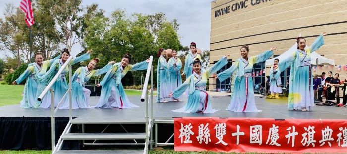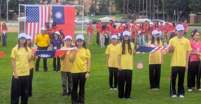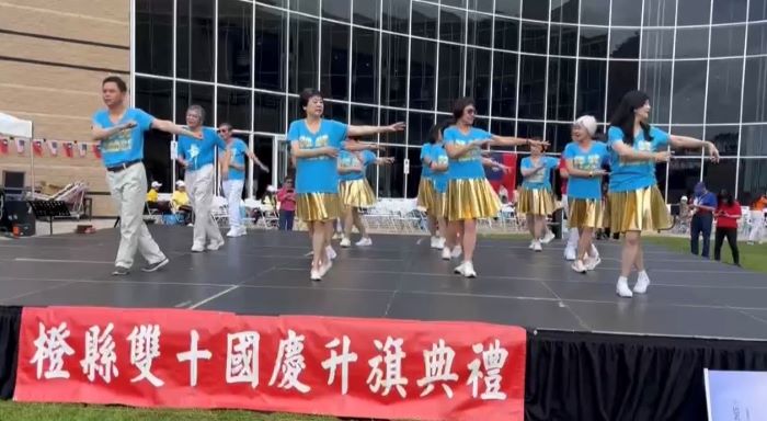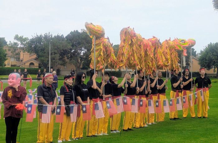 接著展開遊行,包括台大舞龍隊、台大校友會、駐洛杉磯經文處、北一女樂活班、世華橙縣分會、爾灣銀髮族口琴樂團、爾灣松柏合唱團、後期聖徒教會耶魯支會、北一女儀旗隊、南加州大專院校聯合校友會、政大校友會、成大校友會、加州台灣同鄉聯誼會、Go Go 舞團、宇清藝術工作坊、建中校友合唱團、橙縣616童子軍、以及FASCA橙縣分會就定位,展開莊嚴肅穆的升旗儀式。