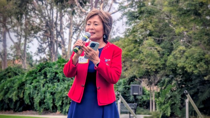 召集人/僑務顧問張竹平致辭,首先感謝籌備工作受到各界支持,今年活動更加周全,參與人數超過600人,比去年更多再創高峯。她還特別提到,僑界此次特地使用布料,製作超大的中華民國國旗及美國國旗,在爾灣市府前大放異彩,象徵兩國美好緊密的友誼,並一同為中華民國114歲生日,送上最誠摯的祝福。