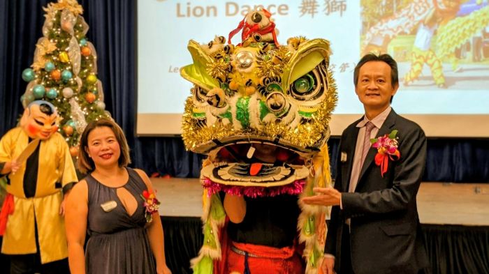 由成大之友舞獅團開場,左為駐洛杉磯經文處紀欽耀處長、右為滿任會長葉旭旻。(記者林蓮華攝)