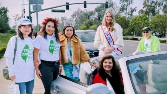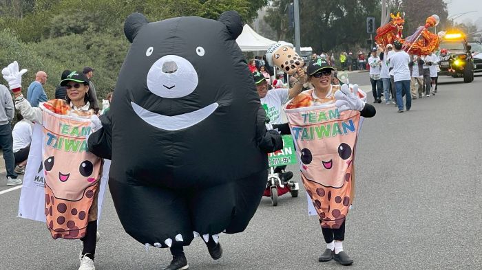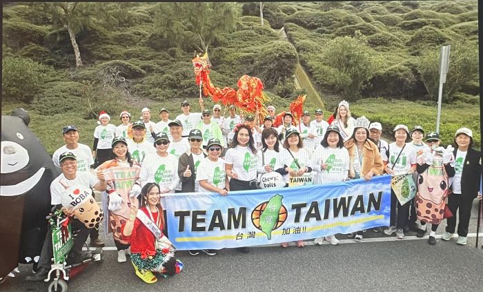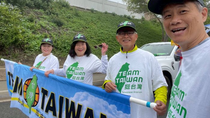來自橙縣與洛杉磯的50多位台灣鄉親,整齊劃一地穿著印有台灣地圖與「TEAM TAIWAN」字樣的白色T恤,手舉「挺台灣」標語,沿途釋放熱情與活力。