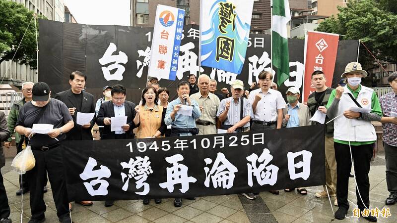 台灣國、台灣基進、前立委蔡啟芳、台聯黨等獨派團體人士今赴中山堂紀念碑前集結,並發表「台灣再淪陷日共同聲明」強調,10月25日不是台灣光復節而是台灣再淪陷日,呼籲執政當局,誠實面對歷史,依照天賦人權的國際法,帶領台灣推動住民自決,建立台灣成為法理國家,確立台灣人的國籍身分及國際政治地位,屆時全民即可普天同慶,慶祝真正的台灣光復節。