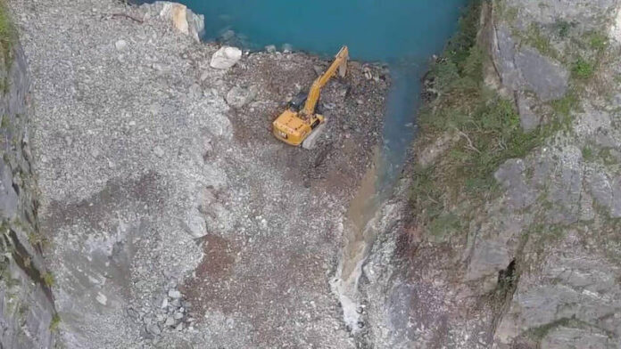 花蓮秀林鄉太魯閣立霧溪燕子口出現堰塞湖,農業部林業及自然保育署花蓮分署23日起進行壩體降挖的減災工程,昨天怪手順利開闢便道上到壩頂;林業及自然保育署指出,今(26)日上午9點進行壩體深槽線開挖,引流湖水以降低水位及蓄水量,截至中午已順利開挖出深槽,湖水開始向下游溢流,空拍畫面曝光。