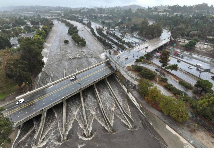 一場被稱為「大氣長河」的異常強烈風暴系統今天侵襲加州南部,近期曾遭野火重創的洛杉磯郡沿海地區紛紛發布洪水警報。一艘移民船在在暴風雨中於加州南部外海翻覆,造成4死4傷。
