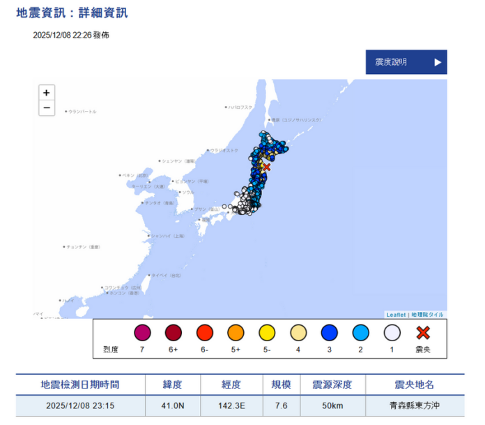 根據日本氣象廳資訊,當地時間8日晚間11點15分(台灣時間8日晚間10點15分),青森縣東海岸附近發生芮氏規模估計7.6、震源深度僅50公里的淺層強震,感受到最大震度的青森縣,震度超過6級。