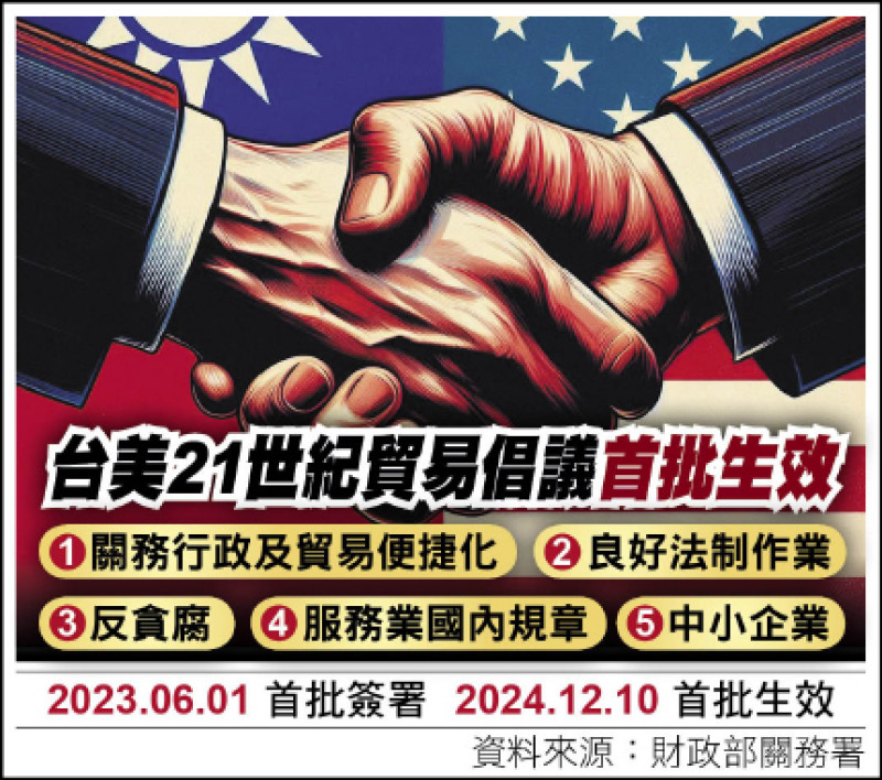 台美在二○二二年六月啟動此倡議,去年六月完成首批協定簽署,在完成相關行政程序後,昨日正式生效。