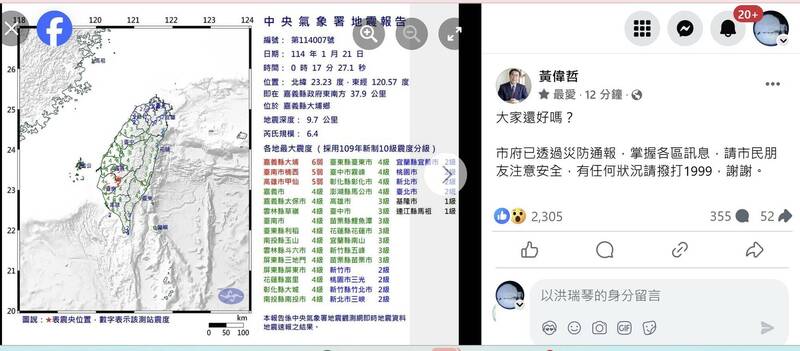 據了解,中央氣象署資料顯示,21日凌晨00時17分在嘉義縣大埔鄉發生芮氏規模6.4地震,地震深度為9.7公里,震央位於嘉義縣政府東南方37.9公里。後續台南發生多起地震。自由時報0120