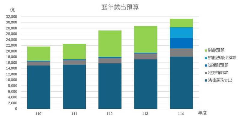 該網友於臉書表示,今(2025)年度的中央總預算為3兆1325億元,扣掉立院不能刪除的義務支出1兆8000多億元,和給地方的補助款2900多億元後,只剩下約1兆初頭能運用。