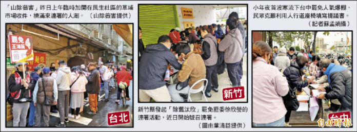 大罷免熱度在小年夜持續加溫,竹縣近日展開罷免藍委徐欣瑩的行動,由於徐本屆以超過五成五的得票率當選,加上花蓮「拔傅行動」、北市「山除薇害」罷免持續進行,顯示罷免列車已開進藍營的鐵票區。