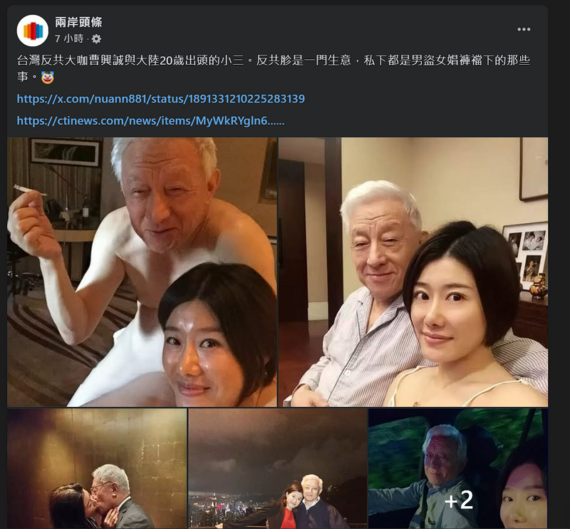 據了解,此真假難辨的私密照片曝光後,有中媒資助背景的「兩岸頭條」臉書粉專,隨即轉發多張曹興誠與單女的私密照,並發文稱「台灣反共大咖曹興誠與大陸20歲出頭的小三。反共胗是一門生意,私下都是男盜女娼褲檔下的那些事」。
