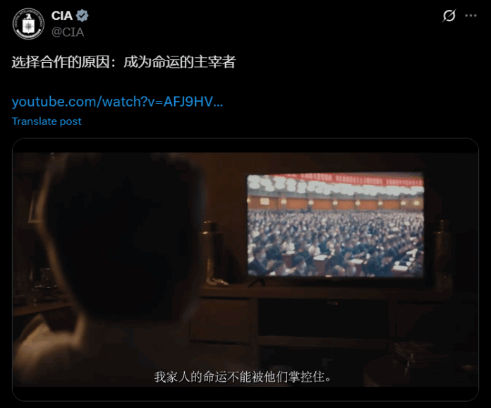 CIA台灣時間1日晚間在官方X平台,發布2段分別以簡體中文「選擇合作的原因:成為命運的主宰者」、「選擇合作的原因:創造美好遠景」為題的宣傳影片。第一段影片內容為,一名中共高官在複雜而不安的情勢中尋求安穩的故事,主角自述他在中國共產黨內一步一步往上升,同時他也看著職位原先比他高的人,一個個被棄如敝屣(暗指習近平黨內清除異己),慢慢地他也意識到自己恐怕也將遭受同樣的命運,黨內同志甚至被自己認為是朋友的人,都希望把他踢開,取代他的位置,主角開始害怕哪天稍有不慎,自己和家人就會「被消失」。