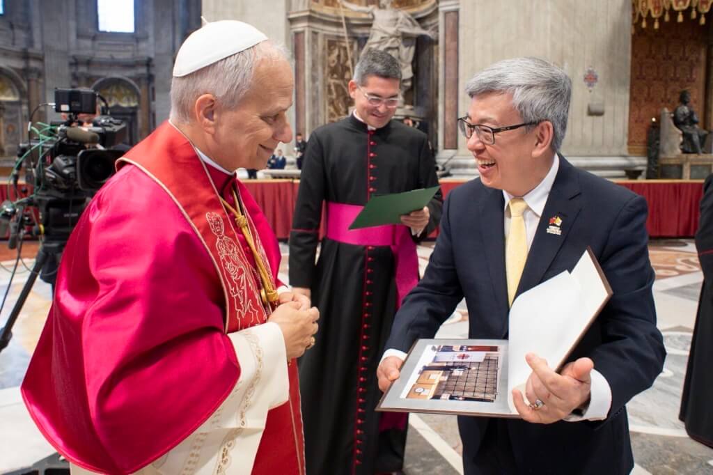 陳建仁在彌撒後獲得教宗良十四世接見,致贈3個小禮物。陳建仁說,第一個禮物是賴總統給教宗的親簽賀函,希望台梵關係能永遠強韌,教宗看了很開心。