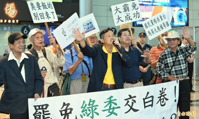 前總統馬英九今出發訪問中國,台灣國理事長陳峻涵一行人,今(14)日前往桃園機場出境大廳,以高唱「我送你離開千里之行,永遠不要回來」的行動劇方式,抗議馬英九再度訪問中國,並高呼「臭要飯的別回來了」口號,痛批馬英九自甘淪為統戰棋子。