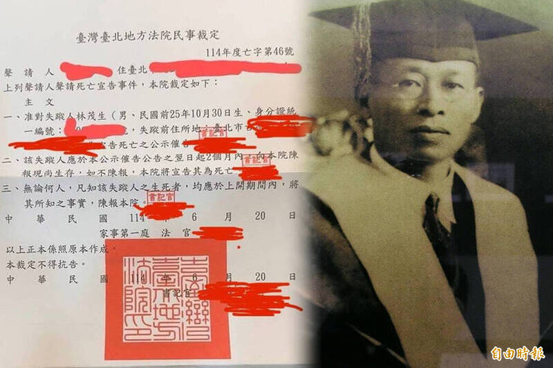 灣第一位留美博士林茂生,在二二八期間疑似遭特務帶走,就此「被消失」至今近80年,其孫輩林承志等家族成員上個月正式向警局報失蹤人口,並聲請死亡宣告。林承志強調,希望透過死亡宣告,將心繫林家三代人的痛劃下句點。