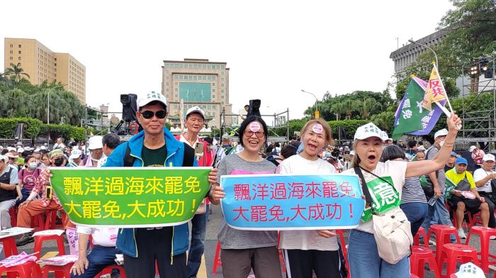 (記者林蓮華/台北報導)首波罷免投票2025年7月26日最後衝刺,由反共護台志工聯盟於7月24日(週四)總統府前凱達格蘭大道舉辦「罷免投同意、台灣靠自己」造勢晚會,儘管當晚滂沱大雨,仍然湧入超過十萬名熱情民眾,現場旗海飄揚,口號人聲鼎沸,呼籲大家拉票「同意罷免」還我愛台護民的立法院;其間非常醒目的標語「飄洋過海來罷免」彰顯海外人士以實際行動回台投票,捍衛主權,絕不讓中國外力滲透台灣國會。