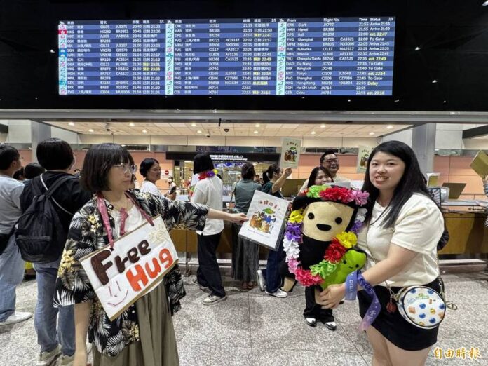罷團志工接機團舉手板寫道「歡迎回家,有您真好」、「歡迎回家」、「歡迎回國,勇敢的台灣因仔」外,還有「台派寶寶娃娃」。罷團志工表示,將持續接機至26日十二時,奮力拚戰到最後一刻。自由時報0725