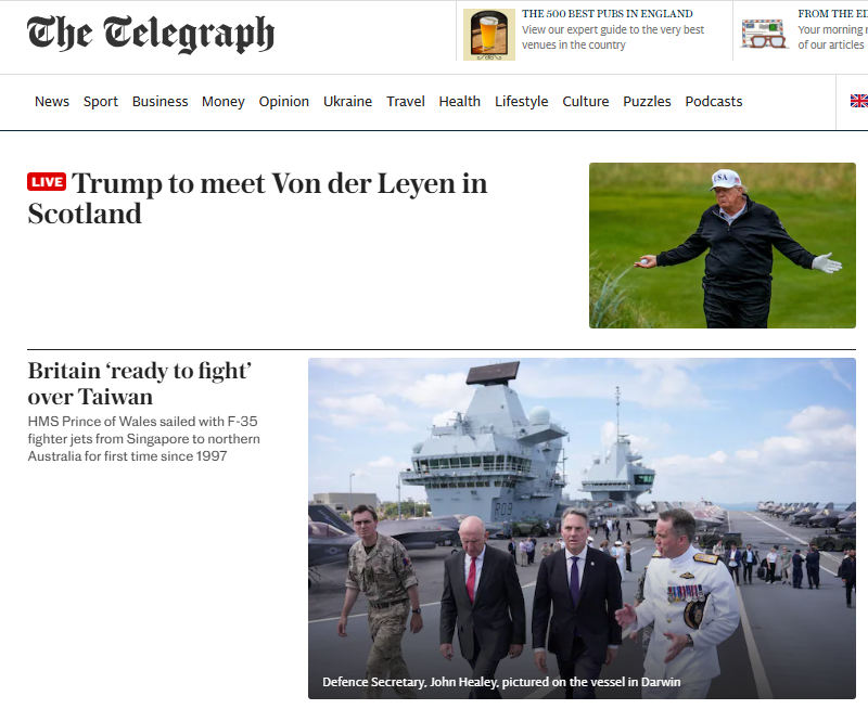 Home即時新聞官網首頁刊登「英國準備為台灣而戰」 英國大報:近年最強硬表態