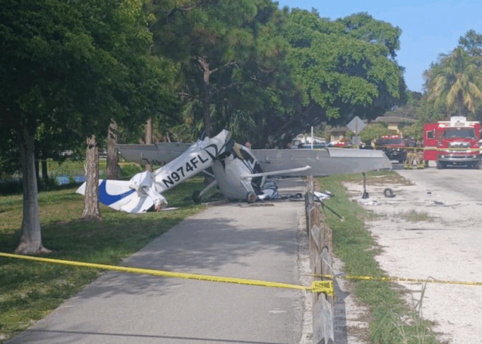 佛州棕櫚灘郡沃斯湖(Lake Worth)附近街區,28日下午4時45分許有1架小型飛機擦撞汽車頂部後墜地,造成7人受傷送醫。