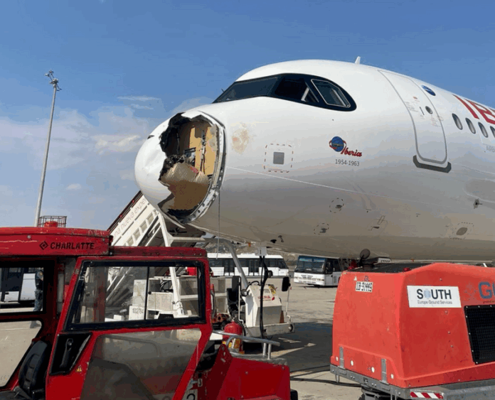 西班牙國家航空(Iberia,又稱伊比利亞航空)IB579航班空中巴士A321XLR客機,3日從馬德里飛往法國巴黎時驚傳遭遇鳥擊,只得緊急返回原機場降落,照片曝光後讓外國網友驚呼連連。