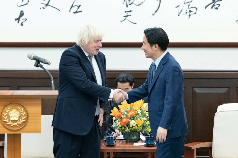 英國前首相強生(Boris Johnson)首度率團訪團,今天會見賴清德總統時表示,包括他在內的英國人民都認為,中國目前對台灣的霸凌行為毫無正當性,這種行為毫無意義,也應該儘速停止,與賴總統的對話也讓他清楚了解,任何試圖霸凌或併吞台灣的行為永遠不會成功。