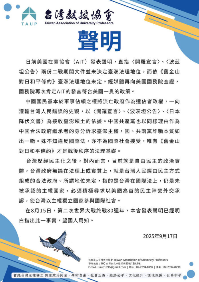 台灣教授協會指出,日前美國在台協會(AIT)發表聲明,直指〈開羅宣言〉、〈波茲坦公告〉兩份二戰期間文件並未決定台澎法理地位,而依《舊金山對日和平條約》台澎法理地位未定。經媒體再向美國國務院查證,國務院再次肯定AIT的發言符合美國一貫的政策。