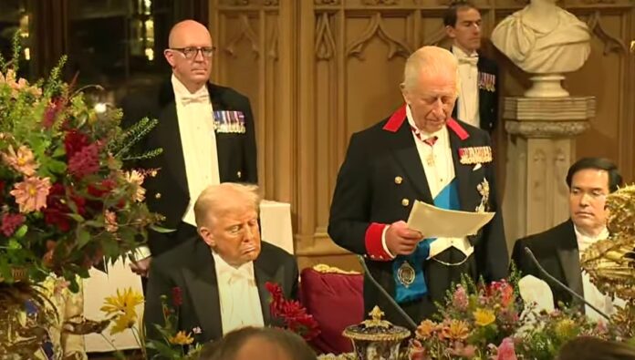 川普抵英後先在美國大使位於倫敦的官邸「溫菲德莊園」過夜。英國國王查爾斯三世與王室成員十七日在溫莎城堡以紅毯、馬車車隊、禮炮、軍機飛行和奢華國宴迎接川普伉儷。川普與第一夫人梅蘭妮雅抵達溫莎城堡後,先由威廉王子與凱特王子妃接待,查爾斯與王后卡蜜拉隨後加入,在沿途一三○○名儀隊護送下一同搭乘馬車前行。後續行程包括觀賞與美國相關的王家收藏品,接著參訪已故女王伊莉莎白二世等多名英國君主長眠的聖喬治禮拜堂。