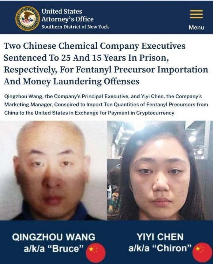 根據英國《衛報》、《大紀元時報》等媒體報導,紐約南區聯邦法院19日宣布,中國湖北省武漢精奧生物科技(Amarvel Biotech)負責人王慶周(Qingzhou Wang),被依輸送芬太尼前體化學品至美國、洗錢等罪名,判處25年監禁,刑滿還須接受3年獄後監督,意味著未來28年,他都將被留在美國。
