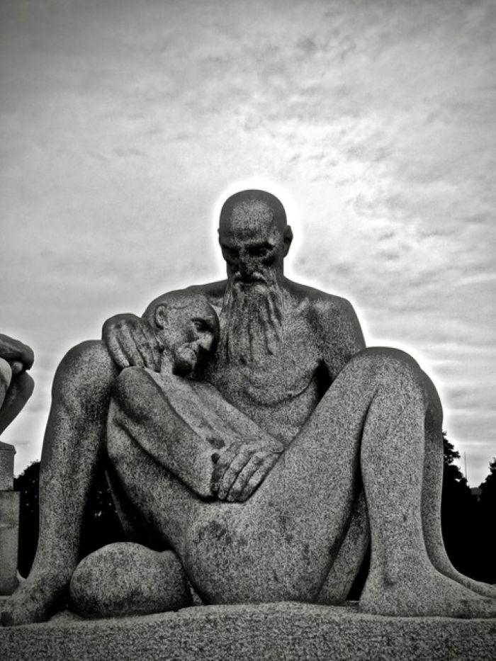 他們離開之後,我們也起身再度走回 ‘生命之柱’的中心廣場,看了許多人生百態的塑像之後,終於又回到 “它”的前面停留下來,我用手輕輕地觸摸它,沒錯,心中自言自語,我來到了。之後,我自己踱步遶行着 “它” 好幾遍,仔細端詳並慢慢地欣賞體會,我還是被 “它”的美覺的意境所感動而熱淚盈眶。大師手法,創意深邃,畢竟非同凡響。 最後在“它”的面前坐下來,靜觀老夫妻的姿態與神情,線條簡單純樸,感受卻是深刻動人。整個彫像對我而言,流露著老伴 走過悲歡歲月的滄桑人生,以及年屆殘燭而安祥接受盡頭終將到臨的無奈。沈思感傷之餘,想起Gauguin所言:I shut my eyes in order to see . 於是閉上眼睛,讓 “它”在腦海中翻騰一陣,想想;真的,人生不過就是如此一般罷了!此刻,Gustav 與我,默然交流,相互無言。他一語不說,卻告訴了我,人生的意義,他用雕塑傳遞了言語及繪畫所無法表達的意念;’LIFE GOES ON…’。 他在他的作品中,讓我看到了片刻的永恆,真的,很了不起!