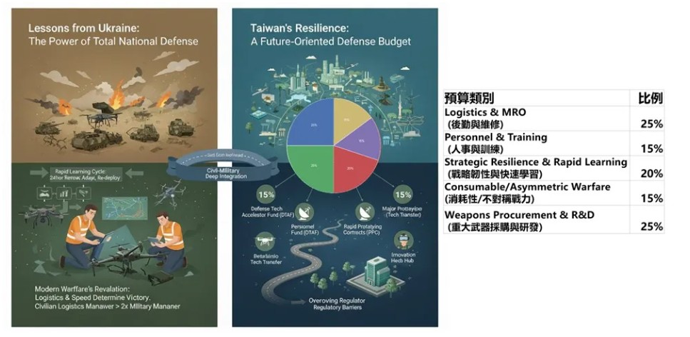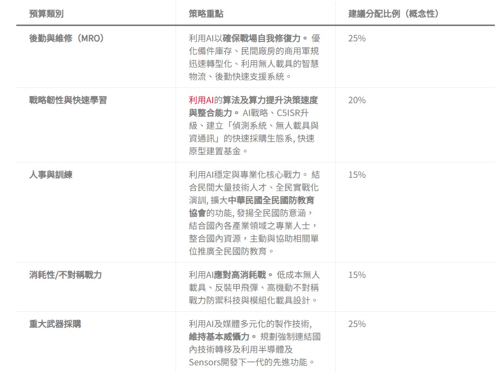 透過將 45% 的預算投入於後勤(MRO)與戰略韌性,才能真正落實烏克蘭經驗中的「後勤優先」原則,確保台灣具備持續作戰和快速應變的能力。