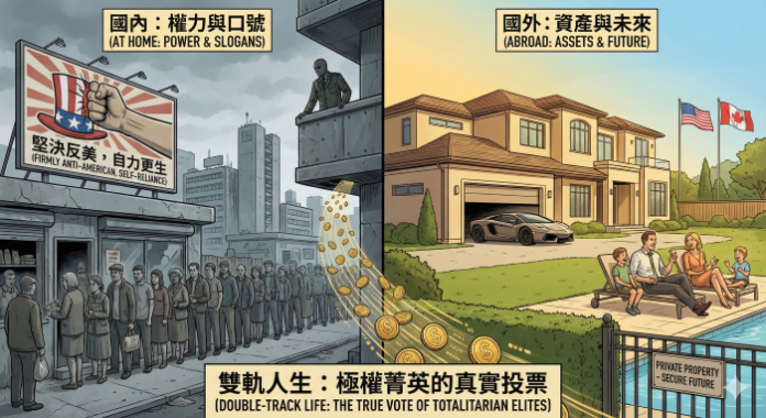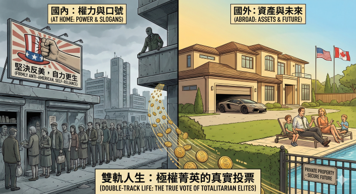 於是,這些國家逐漸形成一種「雙軌人生」:對內,是民族主義、反西方、要求犧牲與忍耐;對外,卻是把家庭、資產與未來全面押注在自由、法治與私有財產保障的民主國家。人民被要求愛國,但統治者早已為自己準備好退路。