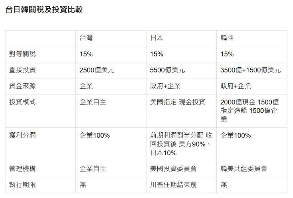 第二,川普政府給予台灣的條件遠比日韓都好。雖然同樣是投資,表面上關稅都是15%,不過日韓兩國的條件都嚴苛很多,例如日本被要求,政府與企業對美投資須達5500億美元,且須按指定項目為標的,前期利潤須對半分配,又如韓國,政府須投資3500億美元,企業將投資1500億美元,唯有台灣我們是真正的自主投資,全由企業決定、營收,而且沒有年限限制。