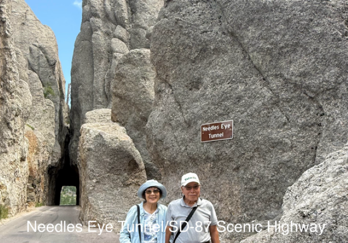 SD-87 景觀公路,有三處在巨石山體開𨮝出狹窄的短隧道,只容車輛單向通行,雖然並無任何交通信號或人員管制,然而任何方向來車,只要司機憑藉肉眼「觀看」,確定隧道內並無車輛時,即可通行。在岩洞隧道入口處附近,石筍林立,視野遼闊,景緻絕佳,尤其是第二隧道,Needles Eye Tunnel,隧道僅寬八呎,還好我們租用的 Chrysler Pacifica minivan 車體也不寬(7.5 呎),恰可無礙通行。隧道口前的停車處,也是「燒滾滾」的景點,經常有十來部的車輛,車進車出,許多遊客,又不時上下車,在此區逗留,賞景拍照,人車嚴重交雜,而遊客多會耐心地互相禮讓,所以並未造成交通事故。遊玩這處景點後,已近黃昏,隨即開車離去,結束這一整天的𨑨迌行程。