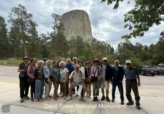 這天,因為急需趕路,我們三部車,並未在塔前的商店停留耽擱,直接往 Devil Tower 後方駛去,5分鐘左右,抵達一此處最佳的觀景地點,下車仰望高高的塔頂,再次 感到大地的神奇與偉大,我們在高塔下,短暫遊蕩一番後,已是近正午時刻,我們大多數人,匆匆又進食 bagel 塗上 Philadelphia cream cheese 的簡單乾糧,配上香蕉或其他水果的簡易午餐後 ,當然少不了與高塔合拍一張團體照,隨後就迅速開車離去,繼續前往 Montana 方向趕路。