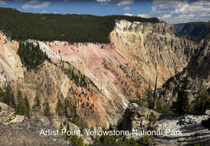 3. Yellowstone River 的河水,不斷地切割山體,經過百億年後,就形成了今日這公園𥚃的 Artist Point 。崖岸天生自然的色彩,綿綿數里,如此的彩崖景致,當然吸睛,也是一處令人難忘的黃石公園的景點之一。