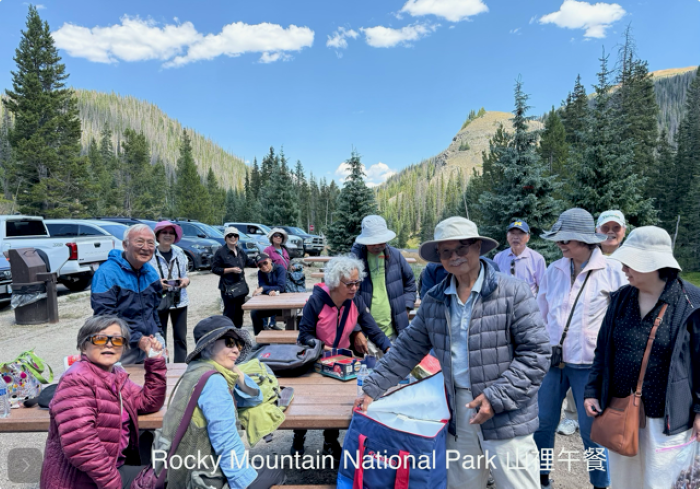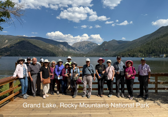 3. 晚午時分,抵達了 Grand Lake ,這是一座由高山融雪聚成的湖泊,冰涼清澈的湖水,結合湖畔的山色,真實地詮釋了大地山水的原貌,清秀優雅。我們這群台裔老人們也不能免俗,就一起排立於湖邊木架觀景平台上,與群山、碧水、藍天、白雲合拍一張照片,真是快樂無比。